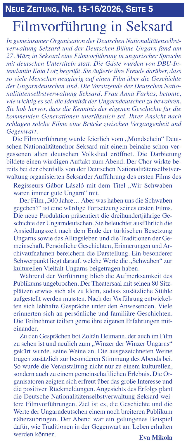 In gemeinsamer Organisation der Deutschen Nationalitätenselbstverwaltung Seksard und der Deutschen Bühne Ungarn fand am 27. März in Seksard eine Filmvorführung in ungarischer Sprache mit deutschen Untertiteln statt.