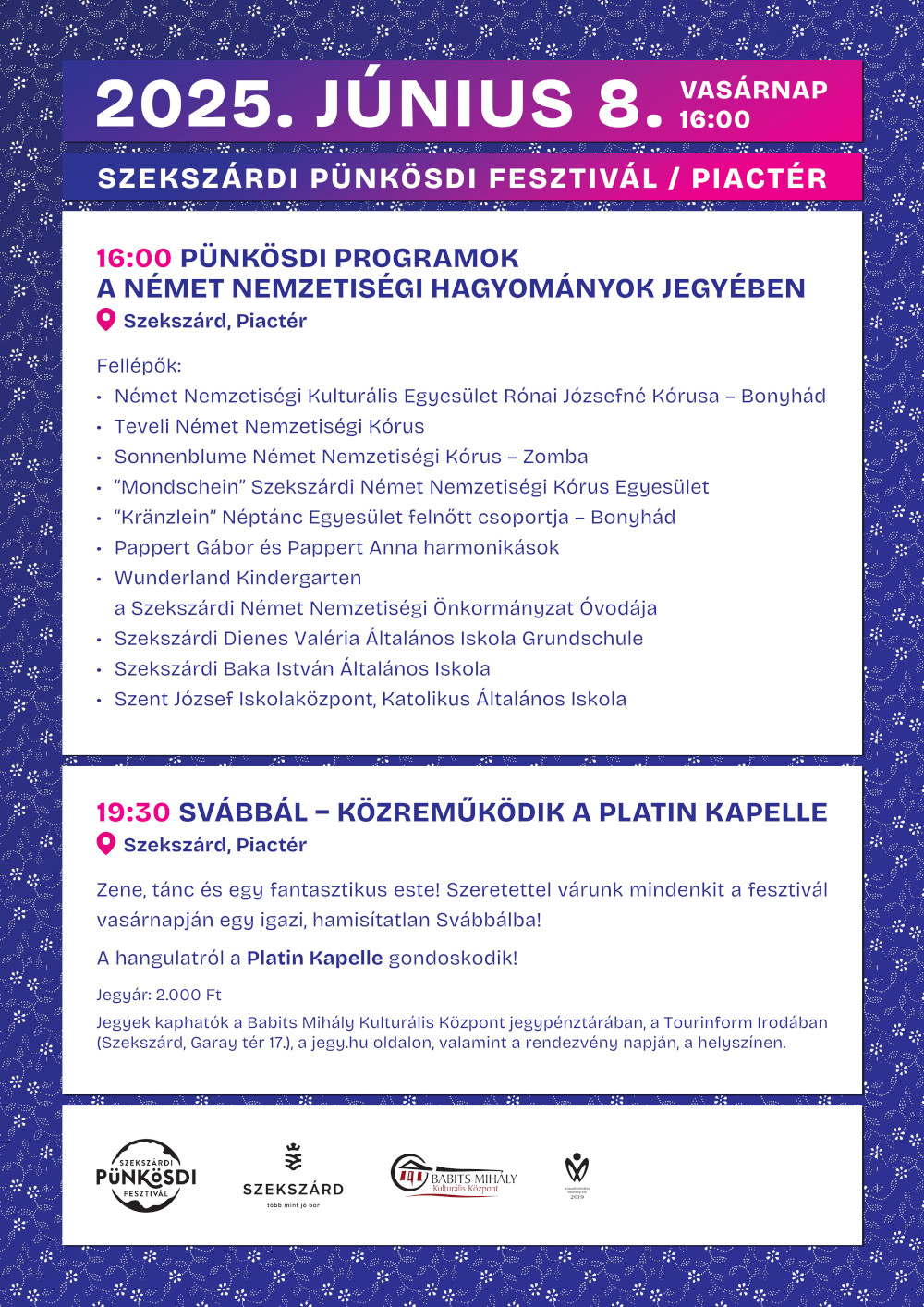 Am Pfingstsonntag veranstaltete die Seksarder Deutsche Nationalitätenselbstverwaltung eine große ungarndeutsche Gala, an der sich elf teilnehmende Gruppen und Solisten aus der Tolnauer Stedt und Umgebung beteiligten. Für diesen Zweck wurde auf dem Marktplatz eine Bühne aufgebaut.